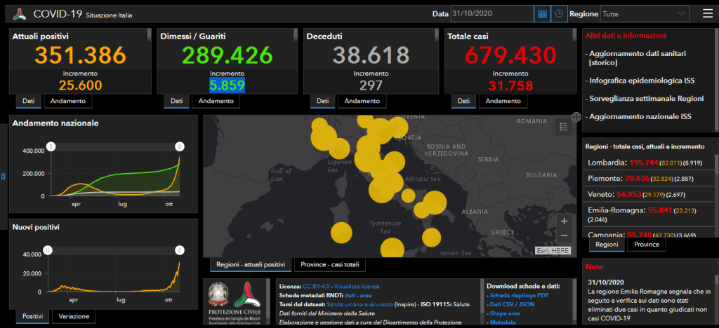 Il bollettino di oggi Venerdì 31 Ottobre 2020. Incremento dei positivi e dei deceduti che oggi sono stati 297.